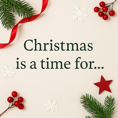 A square festive-themed image with a cream background. In the center, dark green serif text reads “Christmas is a time for…”. Around the edges are Christmas decorations, including green fir branches, a red ribbon, red berries, small white snowflakes, and a red wooden star. The layout is clean and minimal, creating a warm and seasonal feel.