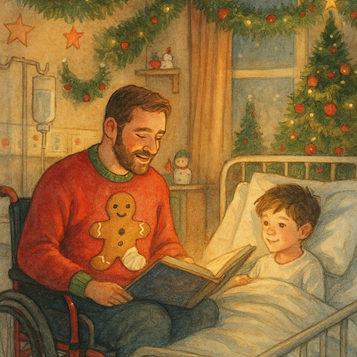 A man - Dan McIntyre - in a wheelchair wearing a festive gingerbread-man jumper reads a book to a smiling child in a hospital bed. The room is decorated with Christmas lights, garlands, and stars, creating a warm, cosy holiday atmosphere.