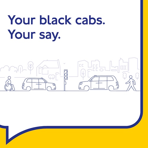 Graphic with a white background and yellow border showing the text “Your black cabs. Your say.” in bold blue letters. Below the text is a simple line illustration of a city street with two black cabs, a wheelchair user, a person walking, and buildings in the background.