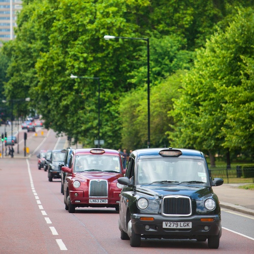Traditional London Black Cabs can be seen driving through Hyde Park.